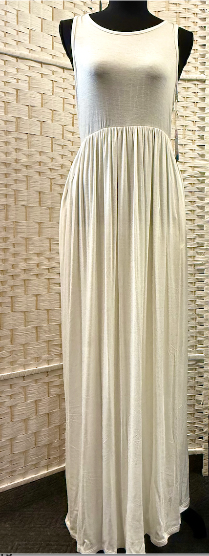 This white soft summer knit tank top maxi dress offers a breathable and comfortable fit, perfect for warm weather. Its figure-friendly design gently drapes to flatter your silhouette while providing ease of movement. Ideal for casual outings or relaxed summer events, this dress combines simplicity with elegance in a lightweight fabric.
